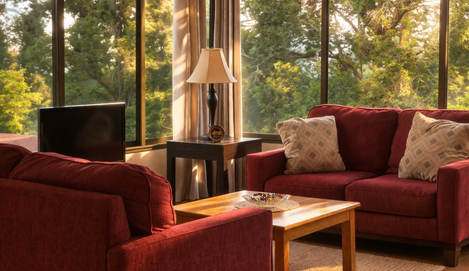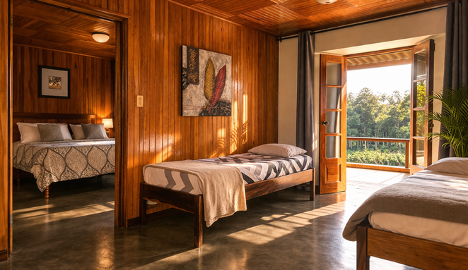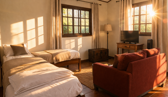Our spacious Family Suite is perfect for families or groups seeking comfort and privacy. It features two separate bedrooms—one with a King bed and the other with two Twin beds—a full kitchen, and a large living area with a TV and two additional single beds for extra guests. This non-smoking suite offers plenty of space to relax and enjoy your stay, whether you're spending time together indoors or exploring the natural beauty just outside.